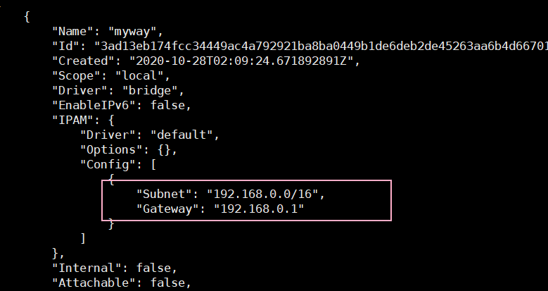 测试 1 2 3 4 5 6 7 8 9 10 11 12 13 14 15 16 17 18 19 20 21 22 [root@mylinux ~] [root@mylinux ~] [root@mylinux ~] 3ad13eb174fcc34449ac4a792921ba8ba0449b1de6deb2de45263aa6b4d66701 [root@mylinux ~] NETWORK ID NAME DRIVER SCOPE 82e83340755d bridge bridge local 45748c46e01c host host local **3ad13eb174fc myway bridge local ** 5c2b996e0092 none null local