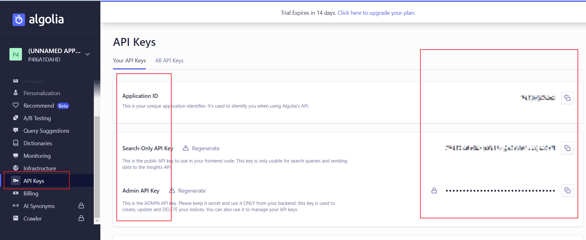 API Keys菜单下 可以看到 我标记的三个keys再加上上面你创建的indices的名称 也就是 ryder