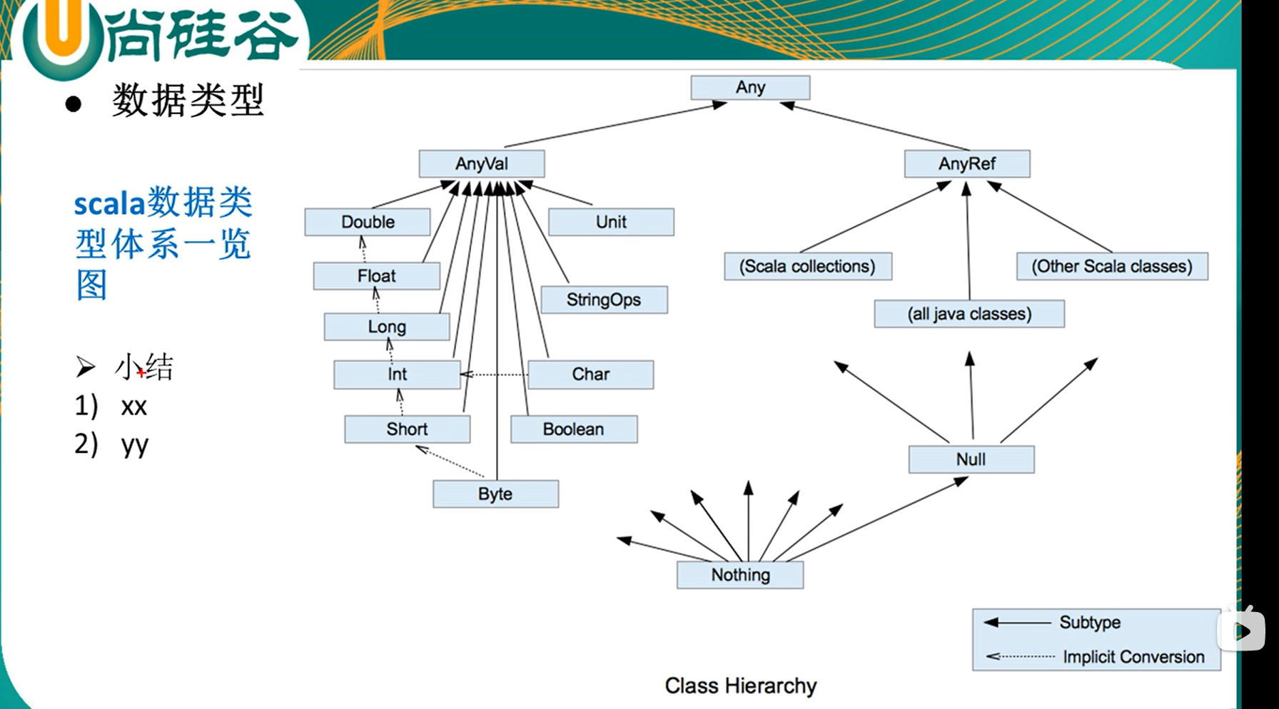- Null类型是Scala特别类型,它只有一个值null,它是一个bottom.class是所有AnyRef类型的之类