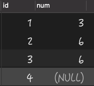 1 2 3 4 5 6 7 8 9 10 11 12 13 14 -- 如果存在 goods 表先删除 DROP TABLE IF EXISTS goods; -- 创建 goods 表 CREATE TABLE goods ( id INT PRIMARY KEY auto_increment, num int ) ENGINE='innodb'; -- goods 表添加测试数据 insert into goods(num) values(3),(6),(6),(NULL); select * from goods;