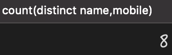 1 2 select count(distinct name,mobile) from person;