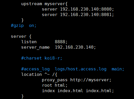在http块中配置 upstream [自定义访问名称] { server host:port;server host2:port;server host3:port;} 配置完成之后我们在location块中配置proxy_pass http://[自定义访问名称]