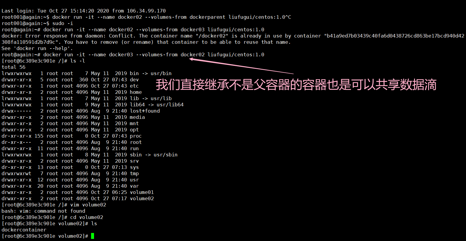 只要通过 –volumes-from 就可以对容器之间进行绑定,达到数据共享