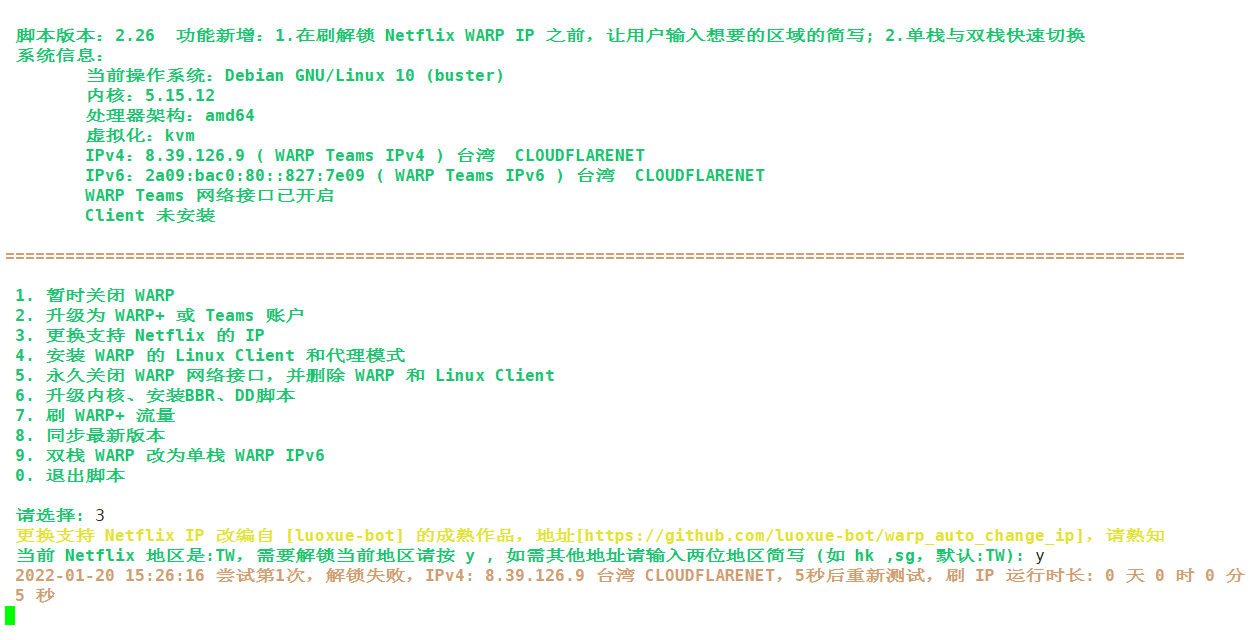 如果使用单栈 不行的话那就使用双栈进行(这一步是安装完成之后配置的,输入warp命令再输入9)