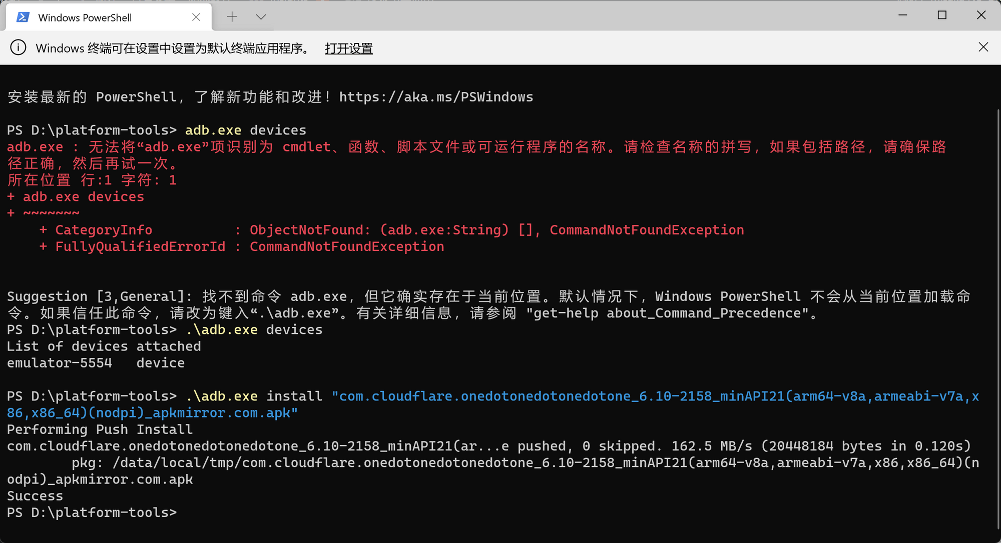 从此处下载 1.1.1.1 APP 的 APK 文件,然后复制到 Android SDK Platform Tools 的程序目录下