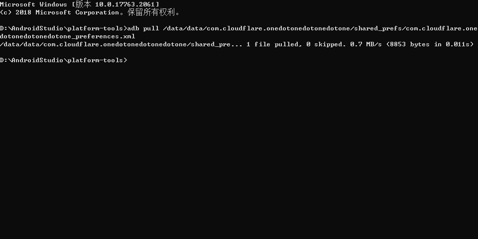 1 | adb pull /data/data/com.cloudflare.onedotonedotonedotone/shared_prefs/com.cloudflare.onedotonedotonedotone_preferences.xml |